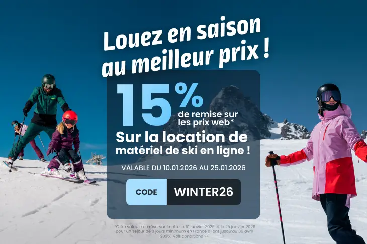 avec le code WINTER26, bénéficiez d’une remise de 15% sur les prix web pour une location de matériel de ski, snowboard et autres glisses.